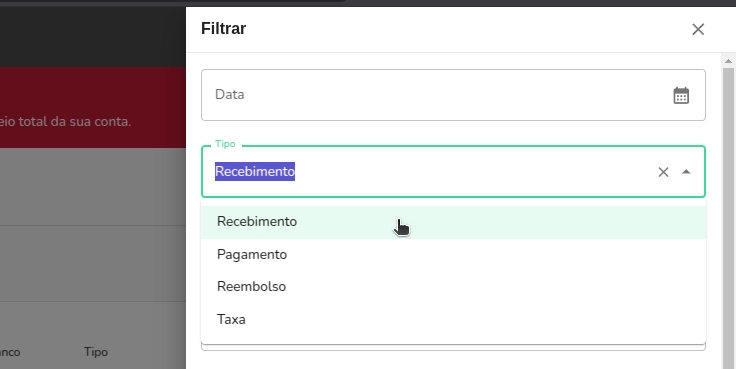 Na lateral esquerda, localize o botão "Filtro", filtre pelo tipo "Recebimento" e aplique o filtro