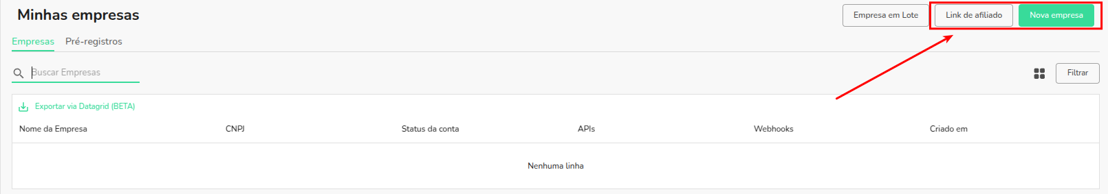 • Pré-registro: onde você verá todas as empresas que iniciaram um pré-cadastro como seu afiliado, porém não completaram a validação e ativação da conta