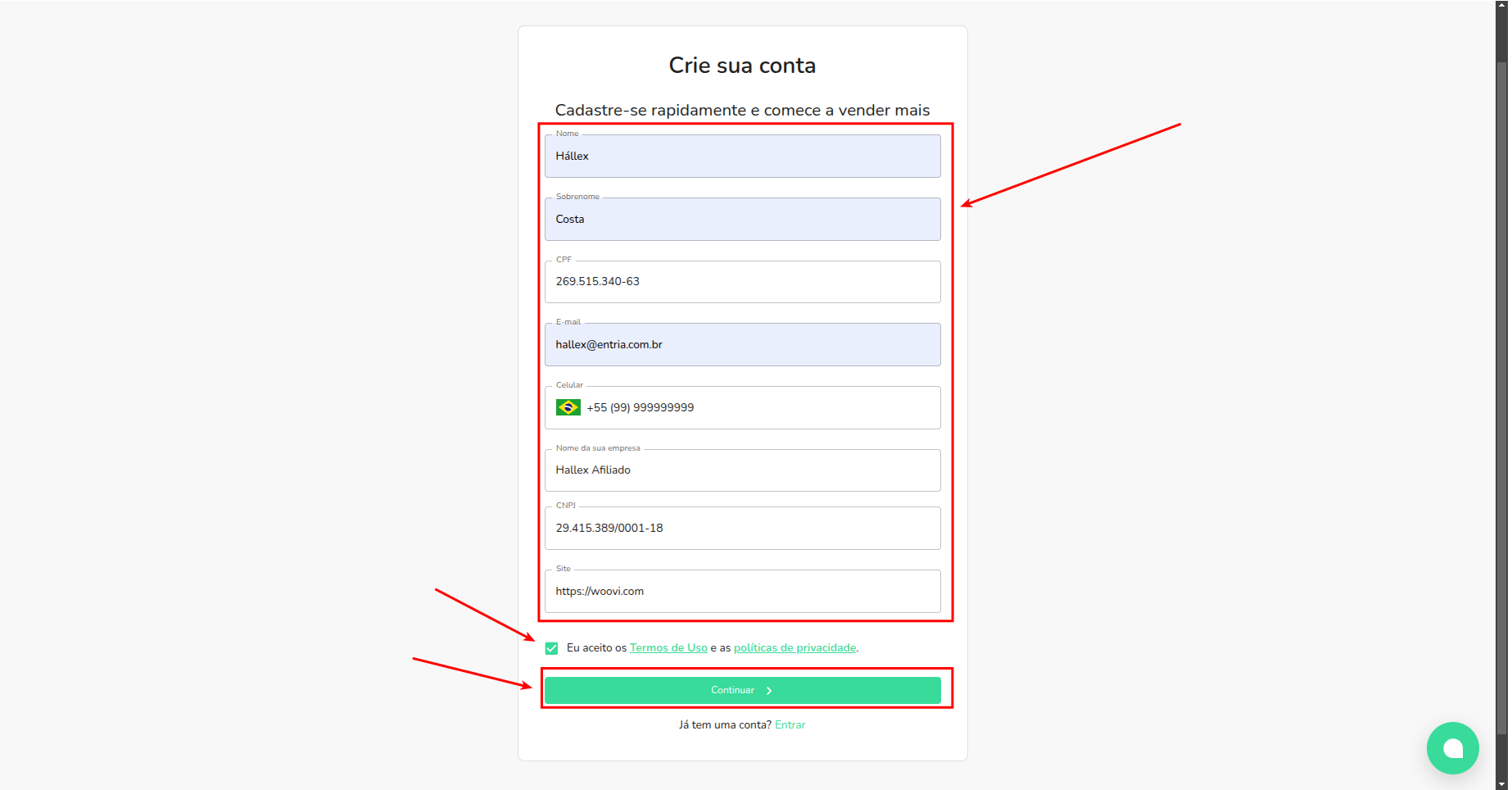 É importante que o afiliado preenchas todas as informações obrigatórias do formulário, aceite os termos e clique em continuar para seguir com a criação da conta de afiliado