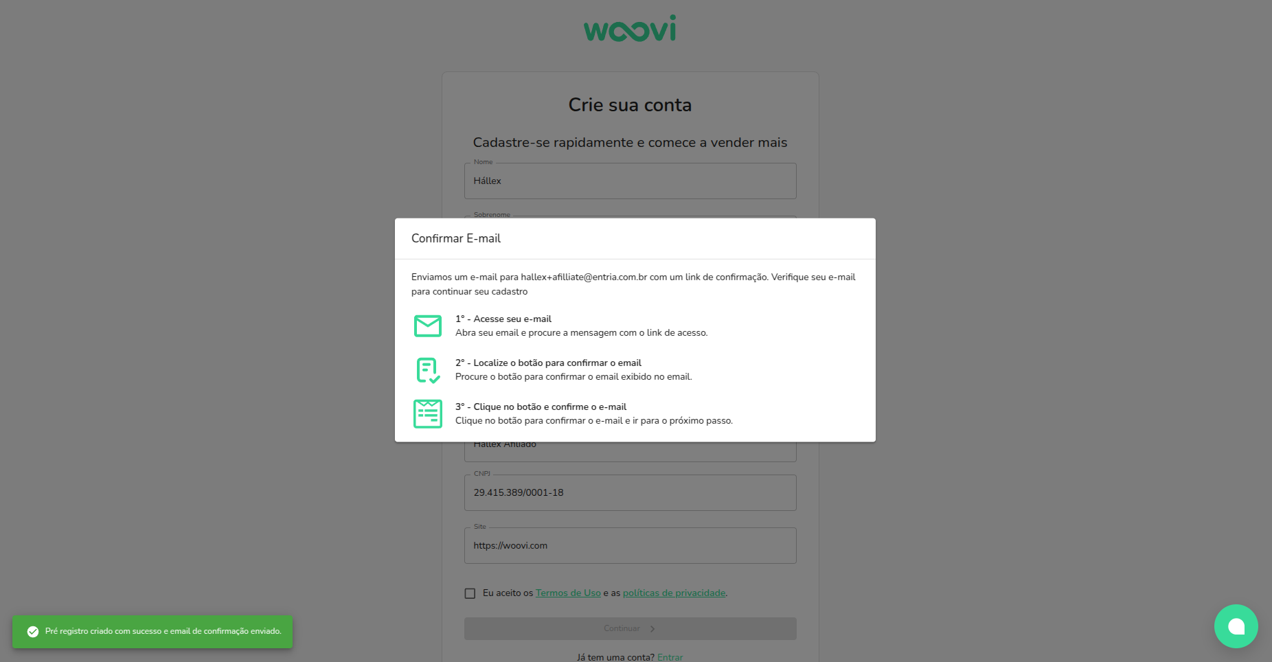 1. Após enviar o link para seu afiliado ou você clicar em novas empresa, ele/você poderá cadastrar na woovi, essa conta será vinculado a sua empresa