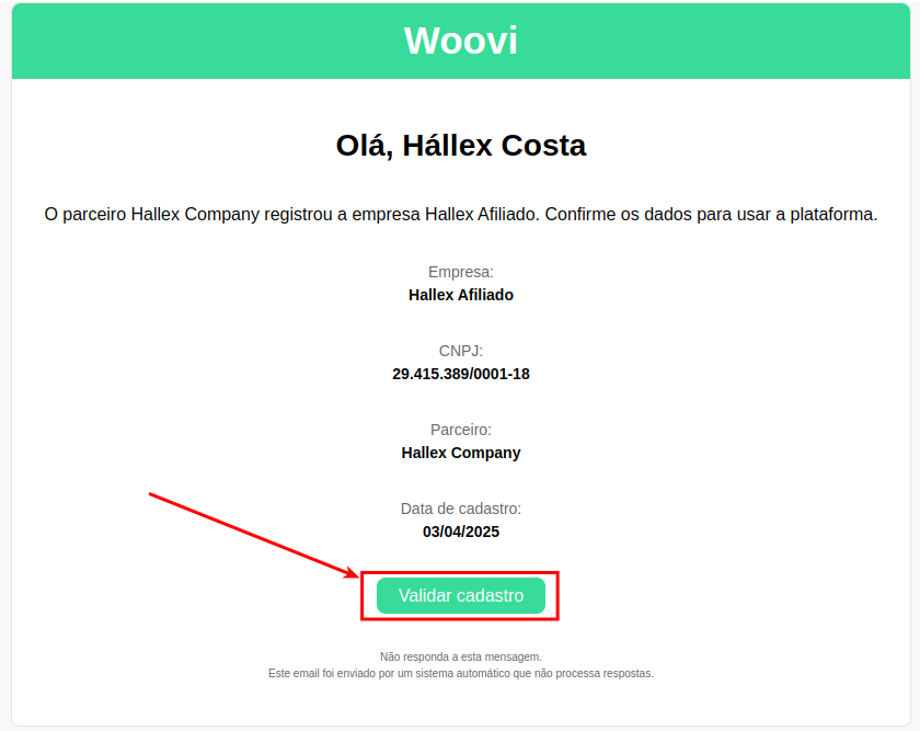 Um link de validação será enviado para o email do afiliado cadastrado, após ele acessar o email ele poderá clicar e "Validar cadastro"