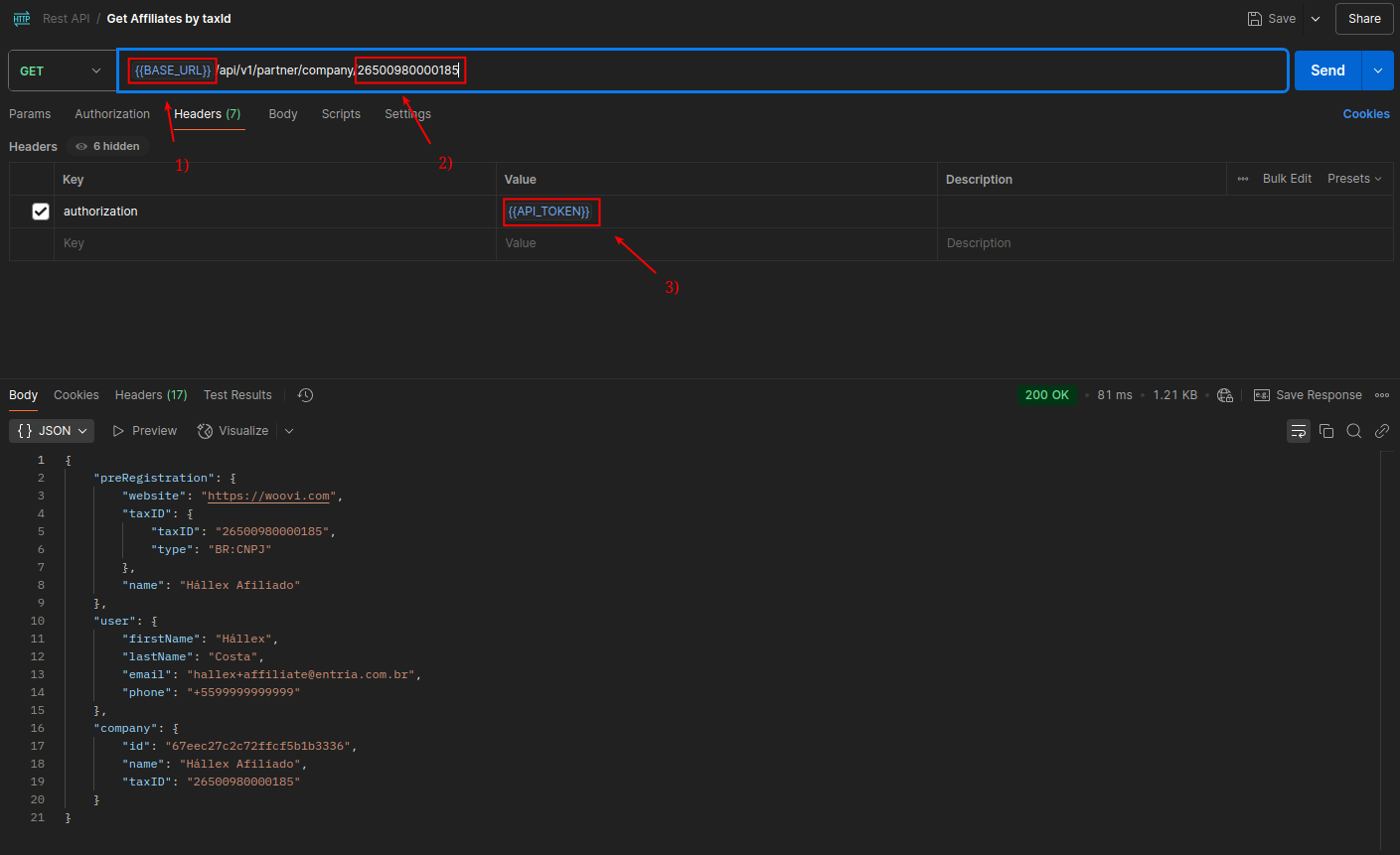 Você pode fazer um chamada para o nosso endpoint /api/v1/partner/company/{taxID} informando o seu appID no header de Authorization da sua requisição, e também substituindo o parâmetro taxID pelo CNPJ do seu afiliado pré-registrado Para saber mais sobre as especificações do nosso endpoint você pode acessar nossa documentação tecnica