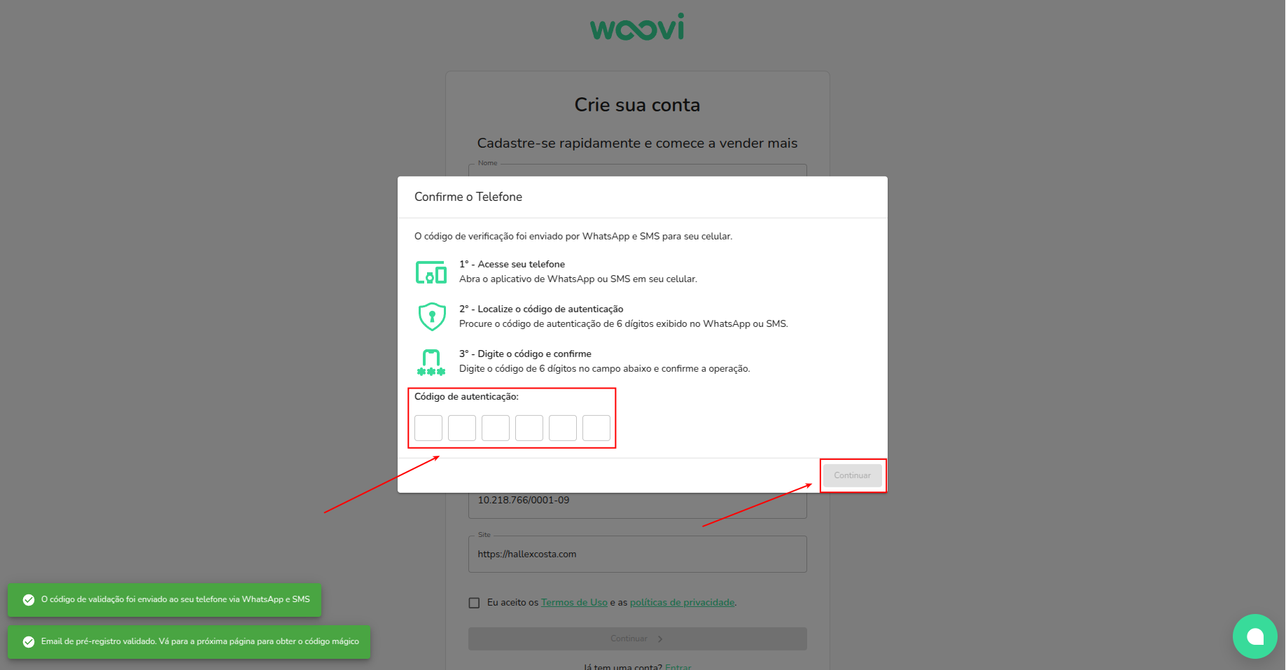 1. Ele será redirecionado para a plataforma da woovi novamente, e solicitare-mos um código de validação de número de telefone que será enviado para ele via SMS ou Whatsapp dele