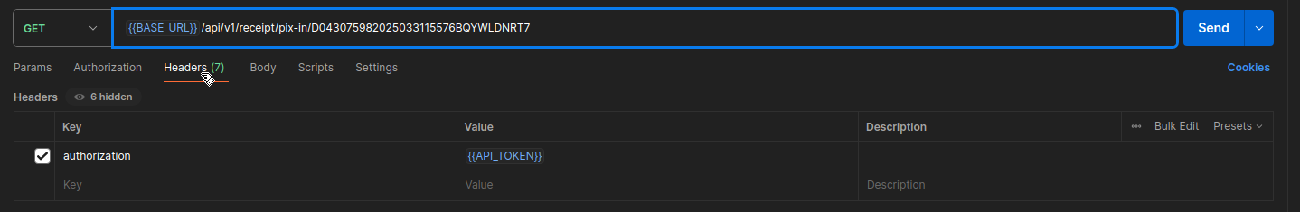 Depois, você pode copiar seu endToEndId e adicioná-lo à URL da requisição da API, utilizando o tipo de comprovante como sendo pix-in